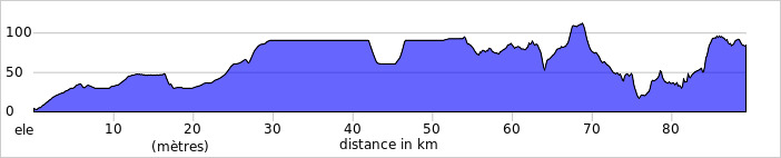 Un déjeuner servi au Centre national de cyclisme de Bromont redonne aux cyclistes l’énergie requise après la courte nuit de samedi à dimanche. Une surprise attend les cyclistes chevronnés après Bromont : l’ascension du mont Shefford. Une montée de 337 m sur 11 km pour bien débuter la journée ! Après une descente tout aussi abrupte, on roule sur près de 70 km surtout plats parmi les vergers et champs de Rougemont, de Saint-Paul-d’Abbotsford et de Saint-Damase. Après avoir contourné le mont Rougemont et le Mont-Saint-Hilaire, le peloton traverse la rivière Richelieu à Beloeil avant d’arriver à son dernier arrêt avant l’étape finale : McMasterville ! |